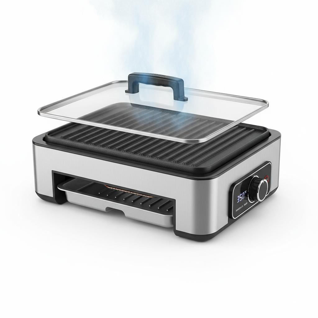 Smokeless indoor electric grill with adjustable temperature control.